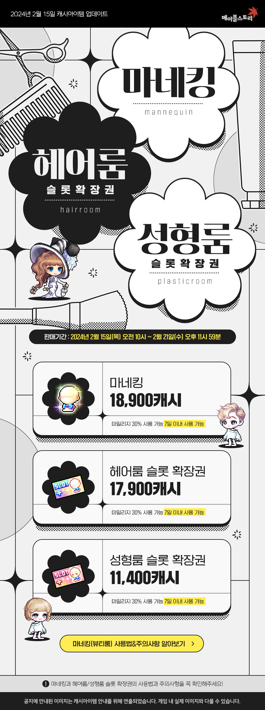 2월 15일 캐시아이템 업데이트 마네킹&헤어룸/성형룸 슬롯 확장권