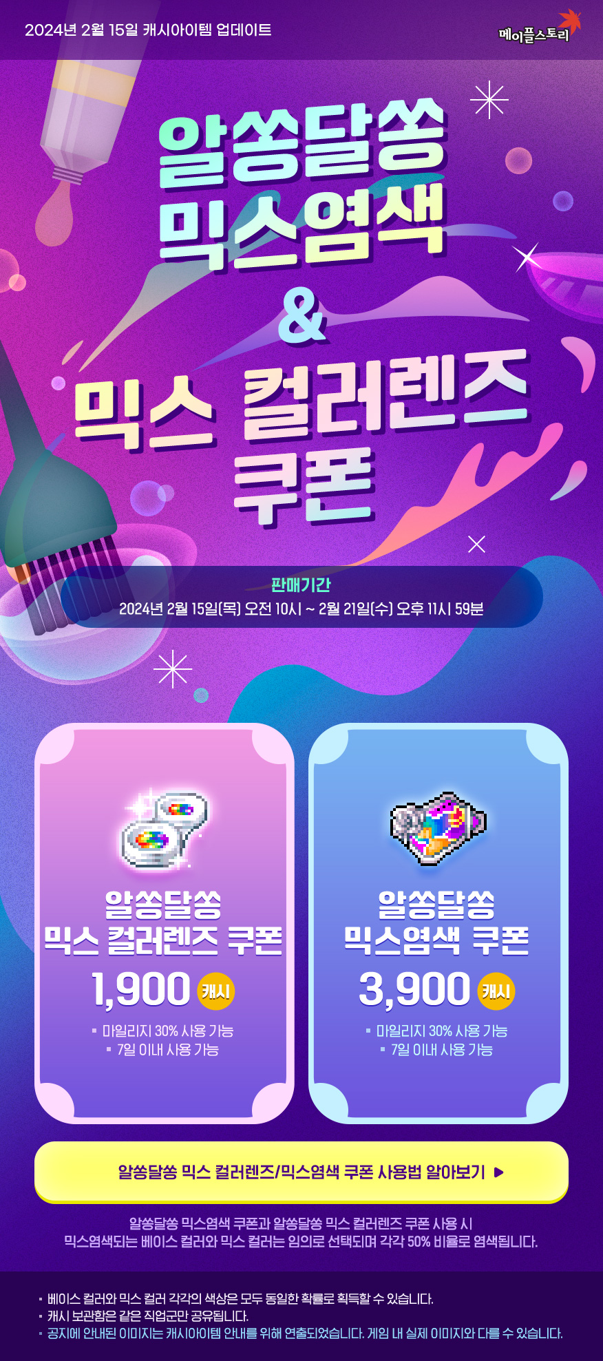 2월 15일 캐시아이템 업데이트 알쏭달쏭 믹스 염색&컬러렌즈 쿠폰